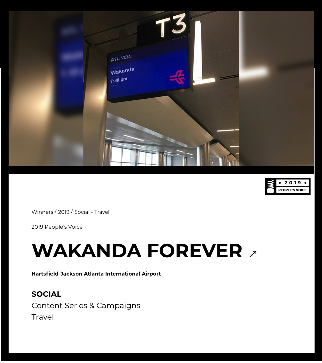 On February 19, 2018, the course of Hartsfield-Jackson Atlanta International Airport’s social media took an unexpectedly #relevant turn when a seemingly innocuous post to @ATLAirport channels turned into a viral sensation. What started as a desire to participate in the Black Panther conversation – it’s local to Atlanta, after all – turned into ATL’s most successful social media post, ever. And won The Webby Awards 2019 People's Voice in the Social Media Content Series & Campaigns category for Travel.